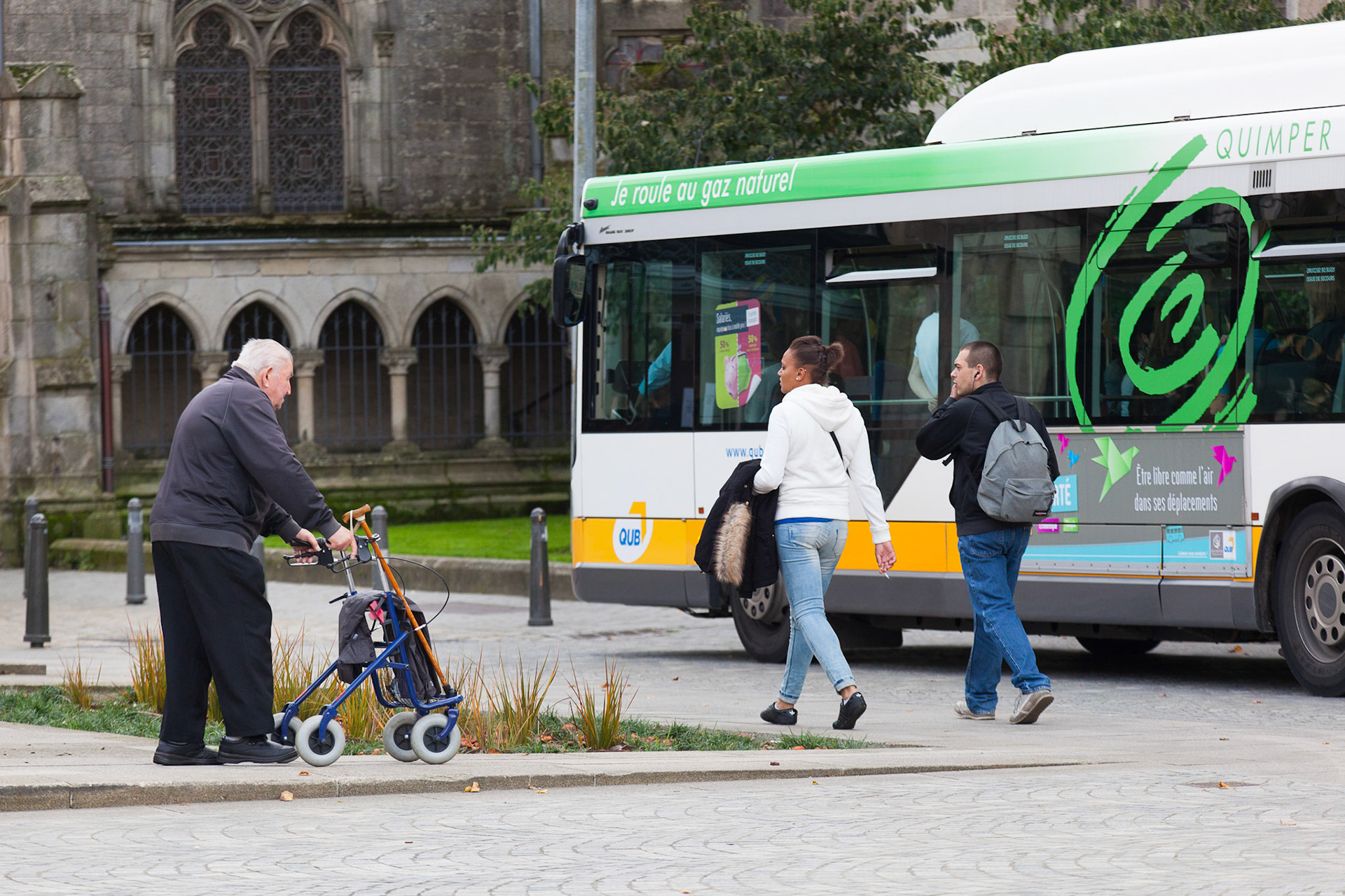 Bus de la QUB fonctionnant au gaz de ville. Petit à petit, les véhicules diesel sont replacé pour des véhicule à énergie plus propre.
